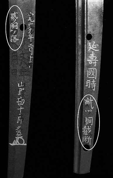 Сьогодні ще можна зустріти старі мечі з написом "Тамеші мей" або "Сайдан мей" на хвостовику Накаго, що свідчить про розрубування 5 людських тіл, найчастіше трупів, але іноді й засуджених чи полонених воїнів. Короткі скорочення звучали як: Рю гуруму – тест стегна, Табі-гата – тест гомілкостопа, О-кесою – діагональний зріз від плеча до протилежного стегна. І хоч дана послуга була досить дорогою, самураї охоче платили спеціально навченим та особливо досвідченим фехтувальникам за можливість випробувати свою нову зброю.